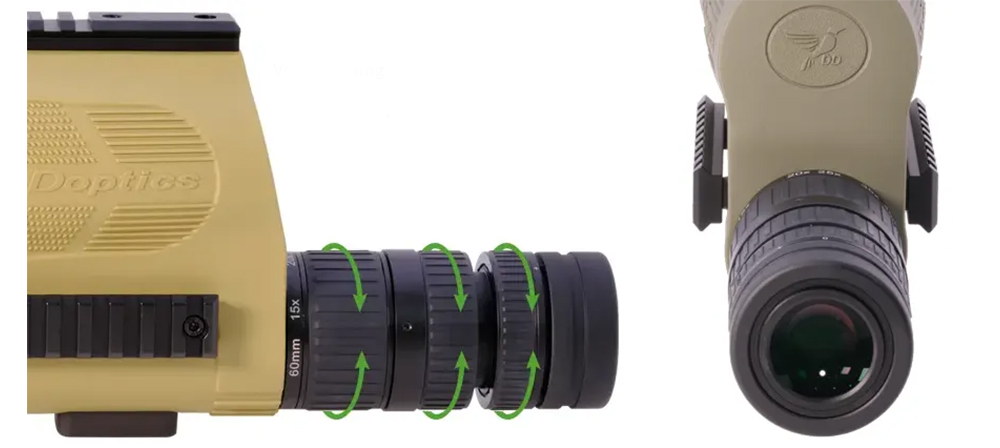 A DDMP 15-45x60 ED taktikai spektív egy külön fókuszállítóval rendelkezik a nagyítás, a képélesség és az irányzék élességének beállításához. Nagy előnyt jelent, hogy ezzel a nagy hatótávolságú spektívvel minden képsík külön-külön is fókuszálható.