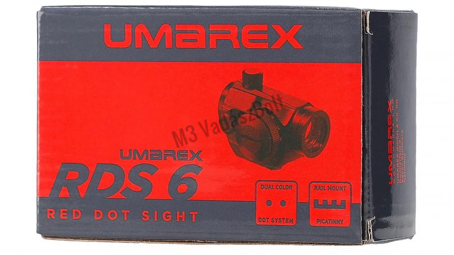 Umarex RDS 6 Red Dot irányzék - Változtatható a pont színe (piros vagy zöld),a pont erőssége pedig 5 fokozatban állítható, a lencse bevonattal van ellátva ami tükröződésmentes felületet képez. Weaver/Picatinny sínre rögzíthető, légfegyverekhez illetve kiskaliberű éles fegyverekhez ajánljuk.Lövésállóság: max. 223RemLencseátmérő: 28 mmSúly: 120gHossz: 66 mmElem: CR2032